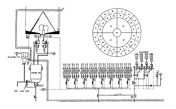 它的均化機理是生料粉由庫頂生料分配器通過8條卸料斜槽,在庫頂成徑向分布,不同時間的生料在不同的料層上具有徑向均化的效果,庫底充氣系統(tǒng)設(shè)計呈放射狀斜向分布,更符合生料粉的流動傾向。環(huán)形區(qū)一般分為8個充氣單元區(qū),可每隔5-10分鐘循環(huán)一次,環(huán)形區(qū)的生料因松動及氣流的引導(dǎo)流向中心區(qū),庫內(nèi)的卸料過程是成柱狀流動切割水平面料層的生料粉,讓不同時間的生料粉進入中心區(qū),由于中心區(qū)的充氣強度大,不同時間的生料粉進入中心區(qū)后得到充分的攪拌,從而達(dá)到理想的均化效果。功率消耗0.1-0.3kW/t,具有較高的均化比。